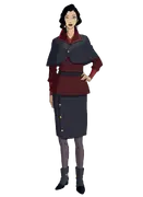 When out in action, Asami wears a dark red/black baggy workman coat, brown gloves, dark red trousers, and red boots with gold trimmings. In Book One, she wears a dark red tunic with puffed sleeves. However, the cuffs of her shirt reach towards her elbow, where it meets with the puffed sleeves. She wears a black belt on her dark red shirt and a black skirt and boots, as well as grey-red tights and a black mini-cape. Her mini-cape and skirt are both black and bound together with golden buttons. When in the winter or visiting cold spaces, she wears a dirty pink winter coat and dress, with black boots and white fur linings on her collar and cuffs.