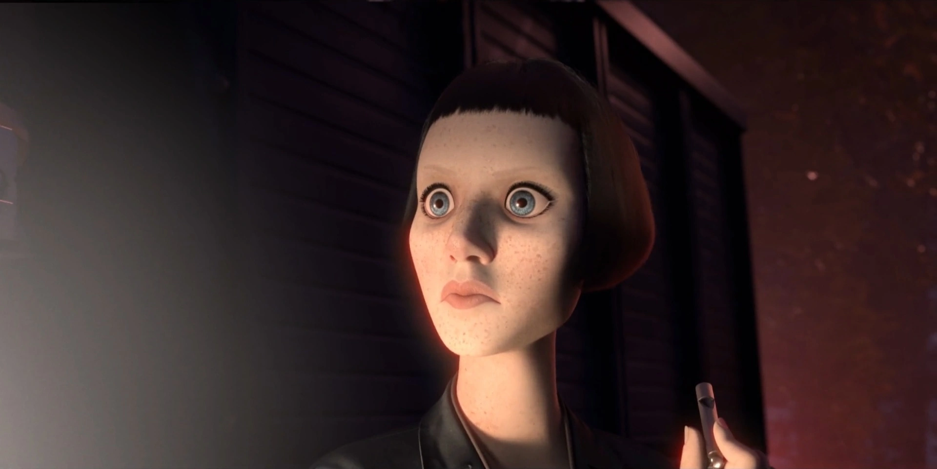 The Atrociraptor Handler is an adult woman with black bob hair. She has pale skin and blue eyes.