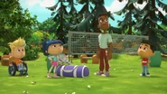 In "Welcome to Harmony Harbor", Ellie along with Niah and Jax go stealthy at night unseen by people. Then they climb up the rope and walk sneaky until they got spooked by the neighbor's light from the window and hide until lights are then off. The trio then climb up the steel ladder and begin their mission watering the flowers. Jax brings out the can bottle but then he dropped it and about fall out but Ellie managed to grab it. Niah reminds Ellie not to over-aater the petunias as she slowly pours it.