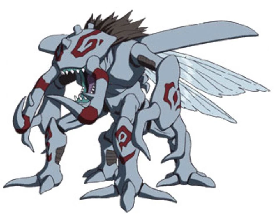 Okuwamon is an Ultimate level Digimon that resembles a large, silver-colored Kuwagamon. It has large wings, four legs, and can use three scissors in battle, and with its scimitar-like hands, it can even cut diamonds.